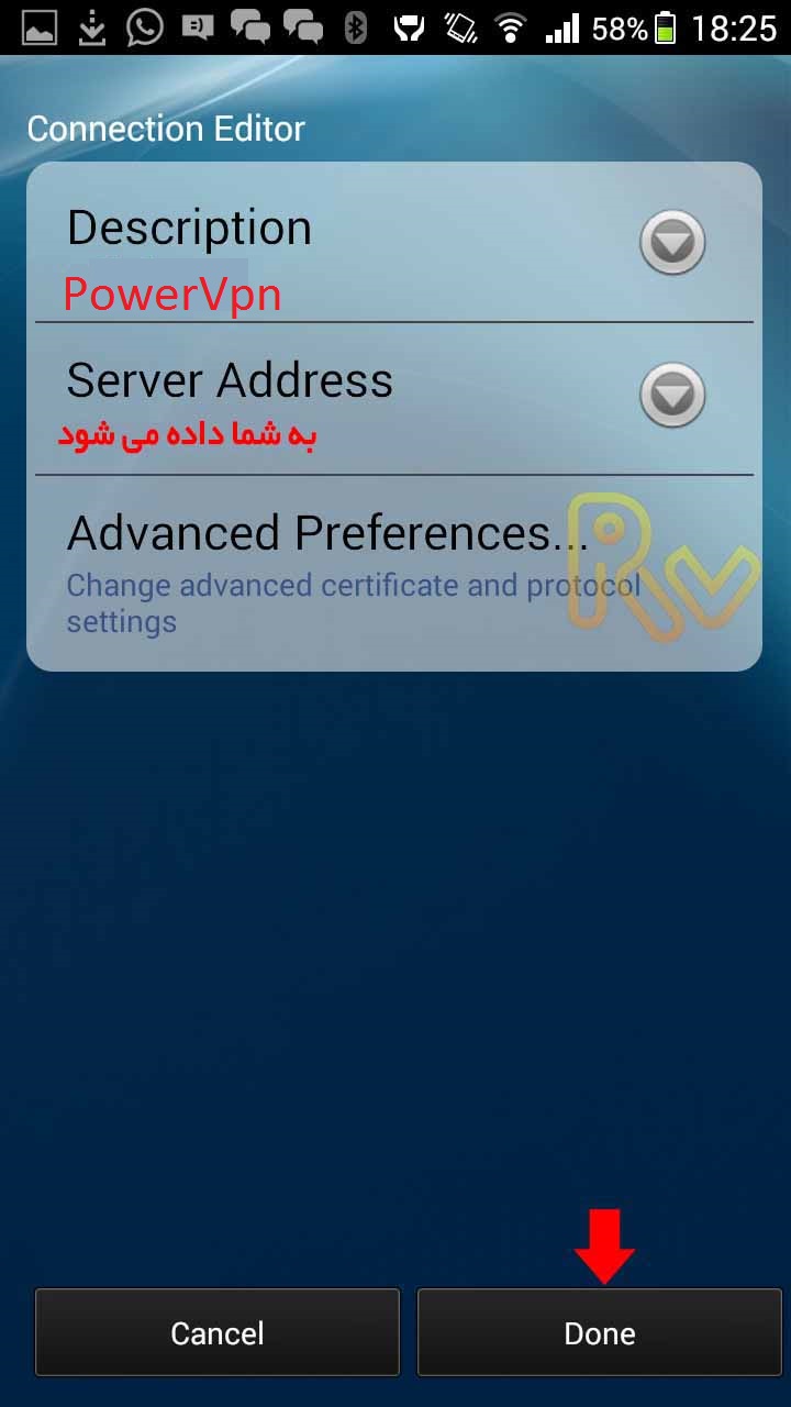 مرحله ۳ : در قسمت “Description” یک نام دلخواه و در قسمت “Server Addres” آدرس سرور شاه وی پی ان که در ایمیل خریدتان موجود است وارد کنید و سپس روی گزینه “Done” کلیک کنید.